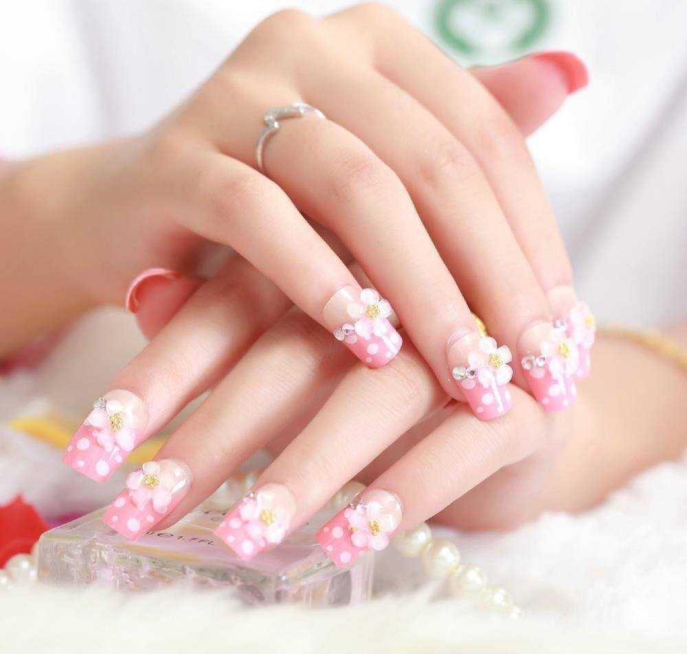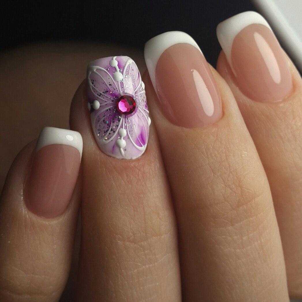 Главное правило здесь – это белая полоска по краю отросшего ногтя (ее можно делать от руки или по трафарету). А вот основу можно выбрать из нюдовых цветов или оставить просто прозрачную базу. Очень красиво и шикарно смотрятся и пользуются популярностью в 2020 году цветы из пластики и малые бусины из бульонок. Лак рекомендуется использовать глянцевый, а также гелевый (проявляется УФ-лампой).
