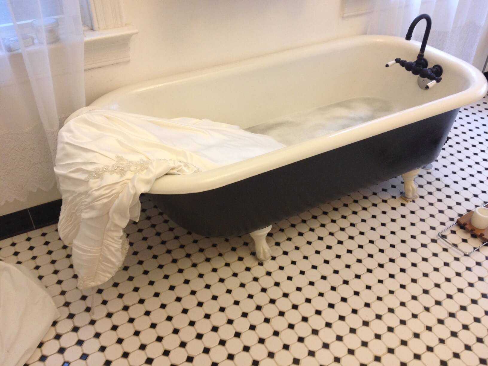 - Спустя несколько минут окатить платье теплой водой из душа, пока не смоется мыло. Оставить изделие над ванной для стекания воды.
