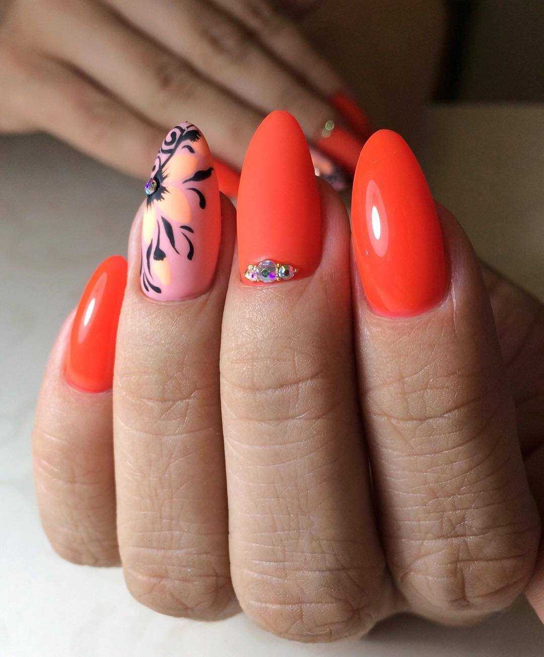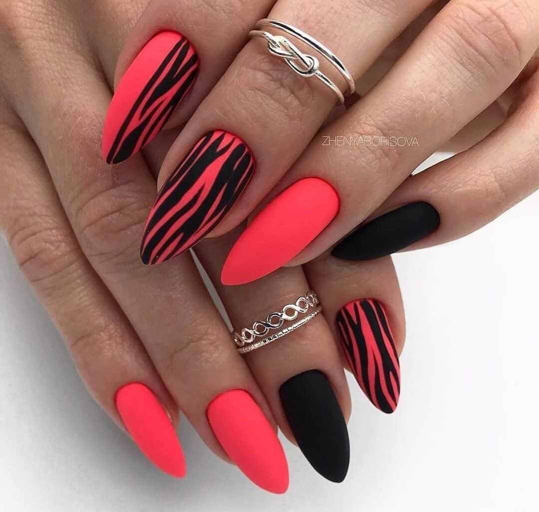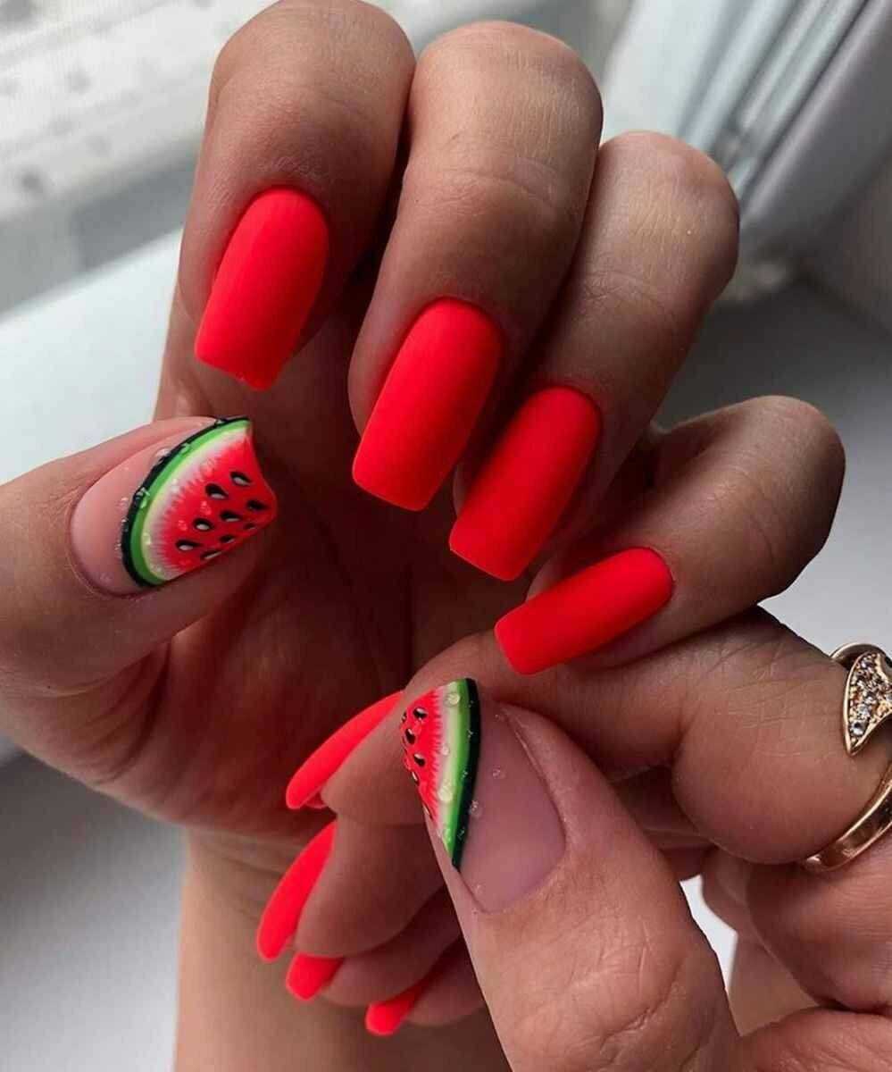 В тренде однотонное покрытие в яркие оттенки, маникюр «разные ручки», матовый яркий маникюр. В летних образах шикарно смотрится дизайн с фруктами в разрезе, флористика, дизайн с хищным принтом, геометрический яркий дизайн.