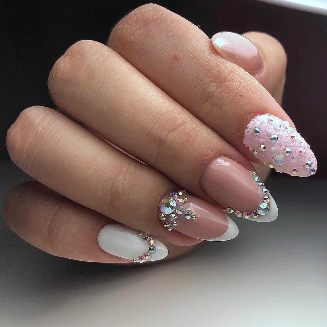 Оформление стразами и блестящим песком добавит шарма и лоска. Стоит взять на вооружение эту модную тенденцию.