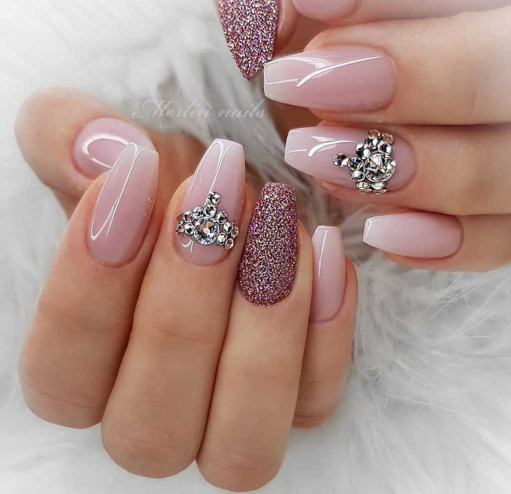 Иногда бывает сложно определиться: стразы или блестки использовать в дизайне нюдового маникюра? Зачем выбирать, вместе блестки и стразы смотрятся еще круче и красивее. Сделайте на указательном ноготке инкрустацию, а мизинец покройте глиттером.