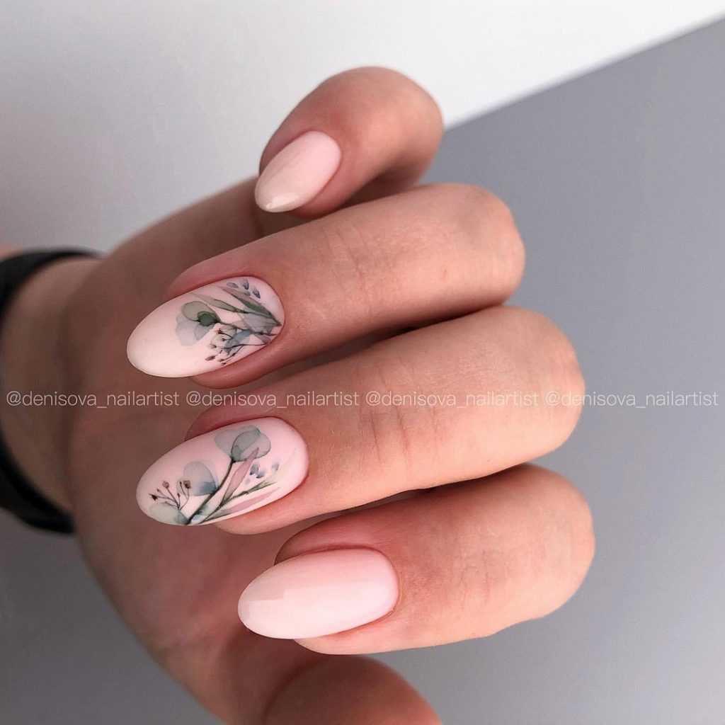 Помимо хищных принтов и строгой геометрии, в модном нюдовом маникюре 2020-2021 нашлось место нежным и красивым цветочным узорам. В этом сезоне в тренде нежнейшие рисунки в стиле акварельных капель.