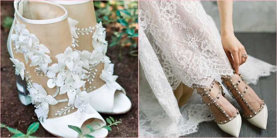 По сравнению с обувью для дневной свадьбы обувь для вечера может быть более щедро декорирована и даже усыпана стразами.