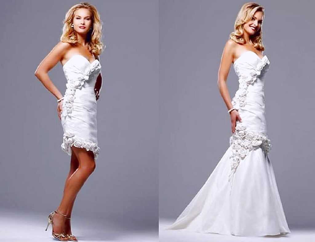 Нередко можно встретить свадебное платье-трансформер, в основном это модели с отстегивающейся юбкой, которые превращаются из макси в мини.