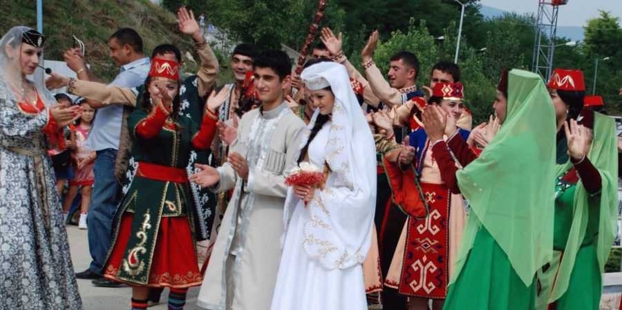 Кричать «горько» молодым запрещено. Да и целоваться не принято, поскольку проявление эмоций от невинной девушки считается неприличным. Разрешено жениху только после ЗАГСа коснуться губами щеки супруги.