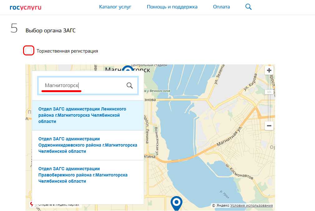 Ниже на странице сайта нужно выбрать орган ЗАГС путем ввода населенного пункта в строке поиска и поставить галочку, если необходима торжественная регистрация брака.