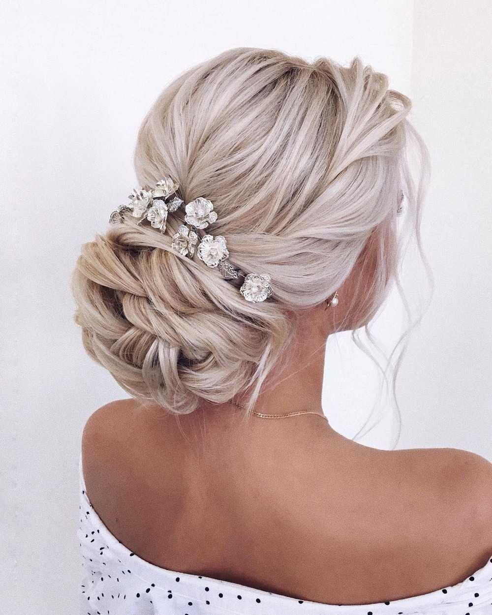 Это может быть гладко зачесанный высокий пучок, который спереди обрамляет диадема, а под пучком крепится шлейфовая фата.