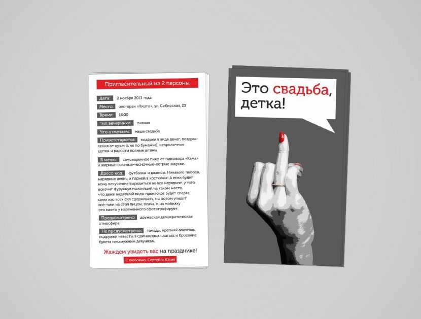 - Приглашение в шуточном стиле будет выглядеть очень оригинальным. Использовать мультяшные образы, нарисованные силуэты, кукольную одежду, пуговицы, рюшечки, веселый шрифт, шуточные фразы или веселую информацию о молодоженах.