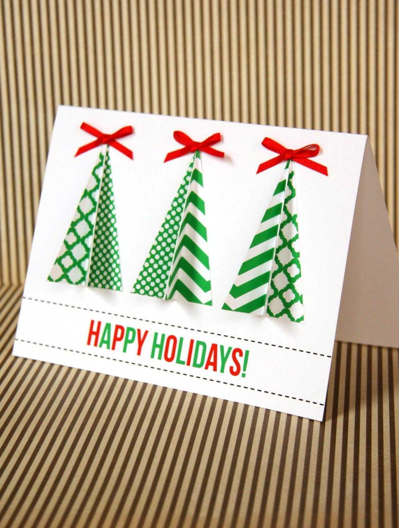 Перед тем, как дать ребенку задание сделать новогоднюю открытку своими руками на конкурс в школу, учителя обычно предлагают варианты оформления. Обычно детям нравится самостоятельно мастерить открытки с новогодним зеленым символом. Елку-гармошку создать несложно: треугольную заготовку сгибают в нескольких местах и нанизывают на веточку/проволочку/декоративную ленту. На лицевую сторону открытки приклеивают готовое изделие и продолжают декорирование бусинами, пайетками и мишурой.