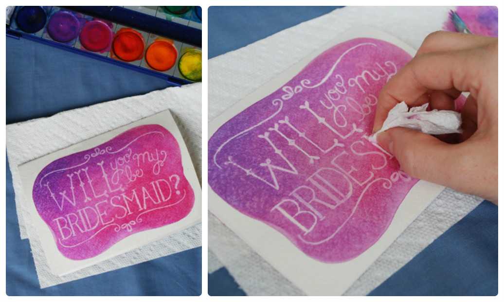 Шаг 4: Когда приглашения полностью высохнут, возьмите бумажную салфетку, слегка смочите ее. Протрите ею все белые надписи и рисунки. Воск должен сопротивляться воде с акварельной краской, но все же кое где он мог прокраситься. Убираем излишки краски. И еще раз проводим белым карандашом надписи. Так мы сделаем их еще ярче.