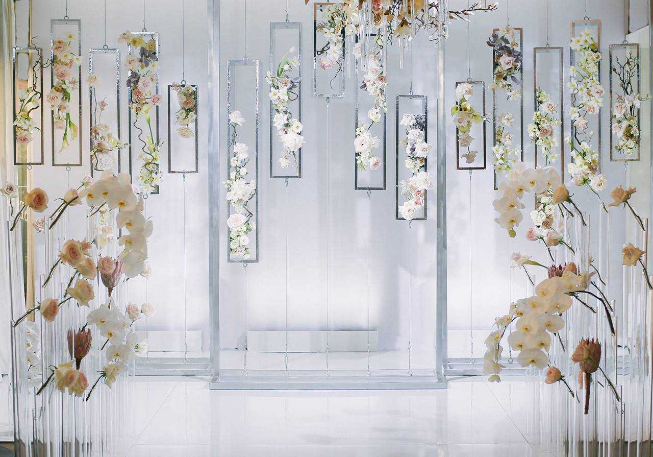 - Развешанные рамки с интересными аксессуарами в стиле, соответствующем свадебному направлению.