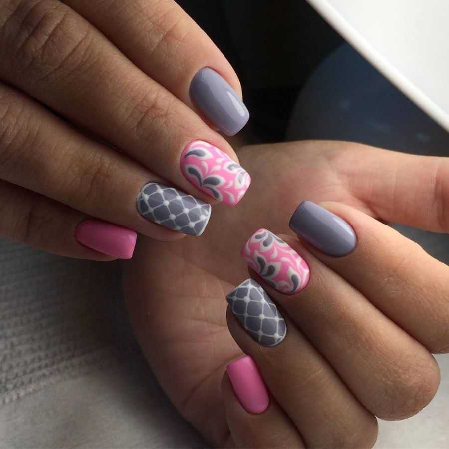 Многие стилисты применяют для создания модного нейл-арта серый с розовым дизайн ногтей. Он представлен такими вариациями оформления: