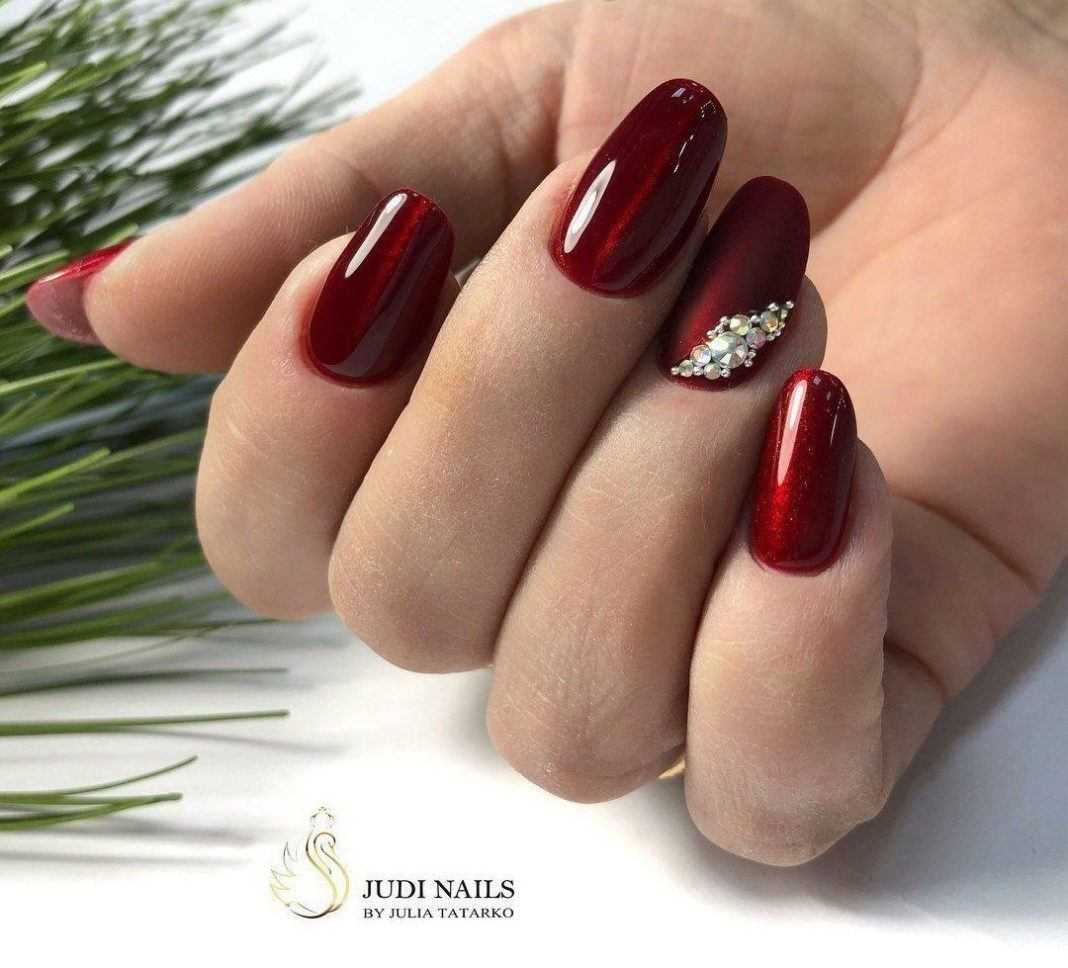 Очень красиво выглядит однотонный маникюр с дополнительным дизайном в виде нескольких страз или же покрытием специальной акриловой пудрой. Такие элементы декора придают завершенности.