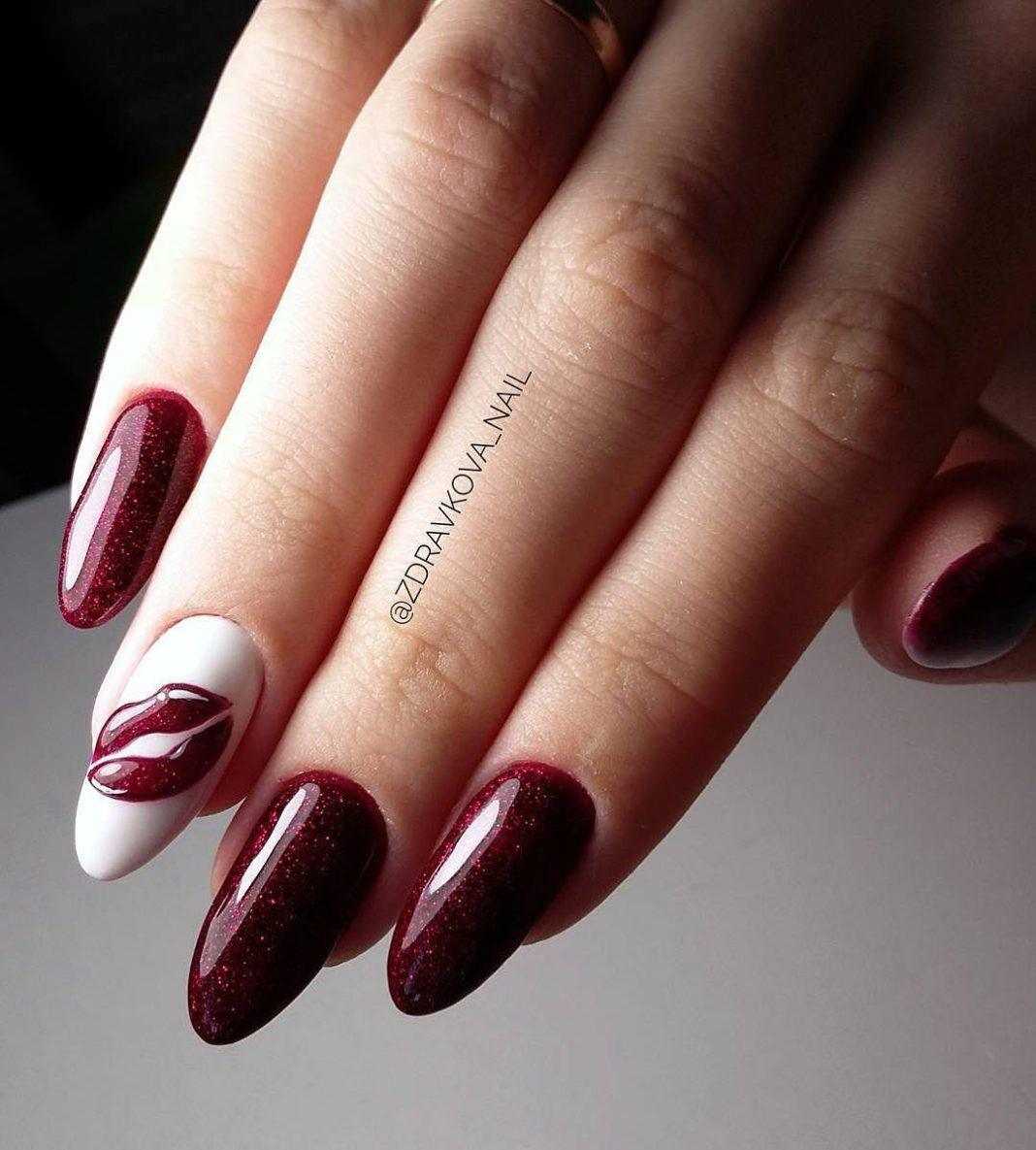 Белый цвет универсальный, поэтому он с успехом сочетается практически со всеми оттенками. Сочетание бордового и белого смотрится очень оригинально как в повседневном, так и в торжественном образе. В тренде самые разнообразные техники: от однотонного покрытия бордовым и белым, до сложных нейл-артов со слайдерами и стразами.