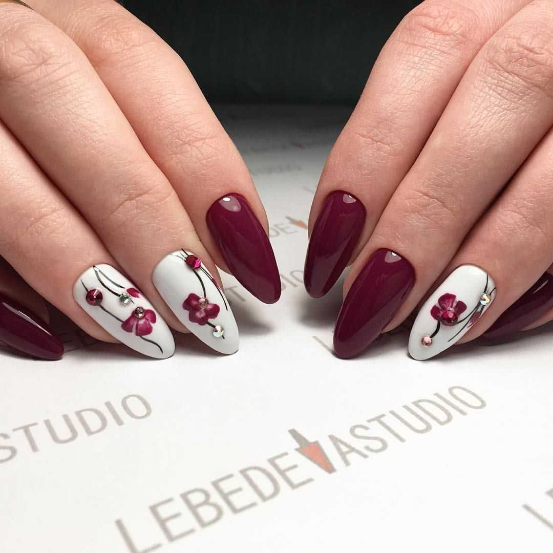Сочетание винного и белого цветов часто используют для создания маникюра с флористикой. Бордовые цветы чаще всего размещают на белом фоне. Для этого используется ручная роспись, аэрография, слайдеры или стемпинг. Под дизайн выделяйте безымянный палец. На нем узор смотрится гораздо заметнее и выразительнее.