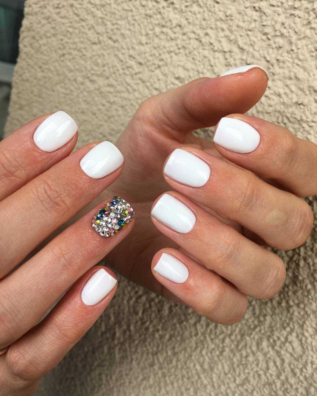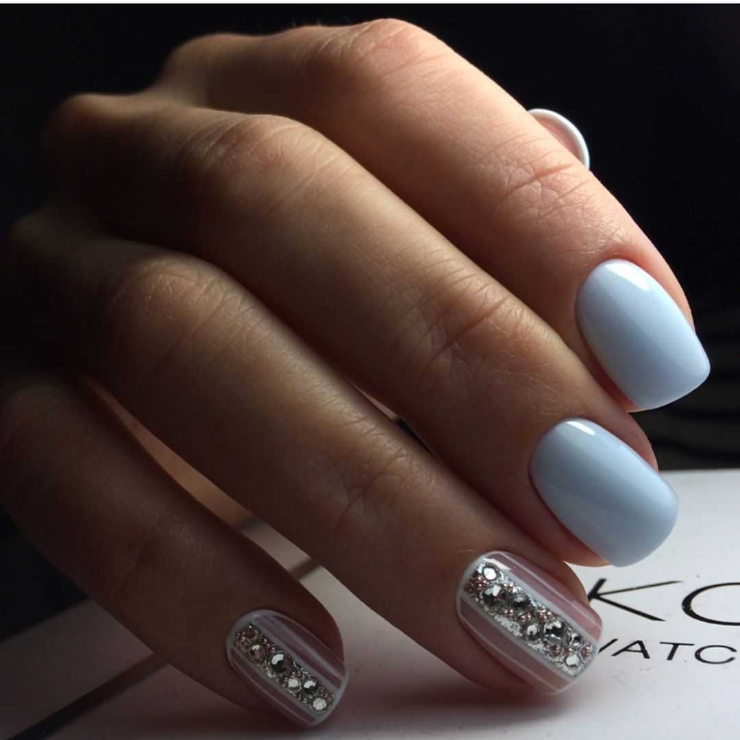 На коротких ногтях прекрасно смотрится монохромное покрытие. Выбирайте классические или пастельные оттенки. Что касается страз, то их можно использовать по одному или же сразу несколько, чтобы выложить композицию. Сделать ноготки визуально длиннее можно с помощью тонкой вертикальной линии из страз. Она может быть расположена по центру, сбоку или диагонально. Отлично смотрится такое оформление на одном или нескольких ноготках