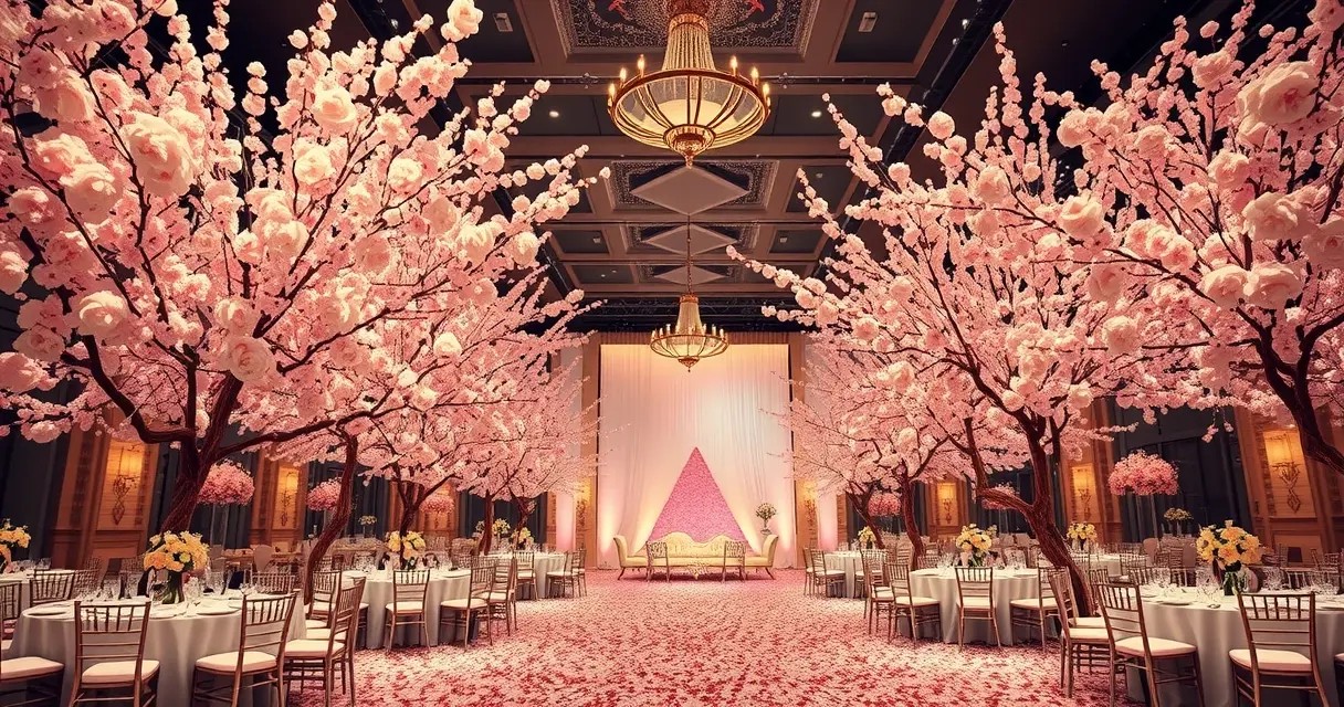 - Цветущие деревья — вишня, сакура, яблоня с искусственными соцветиями; создают романтическую атмосферу и хорошо работают в свадебном и праздничном декоре.