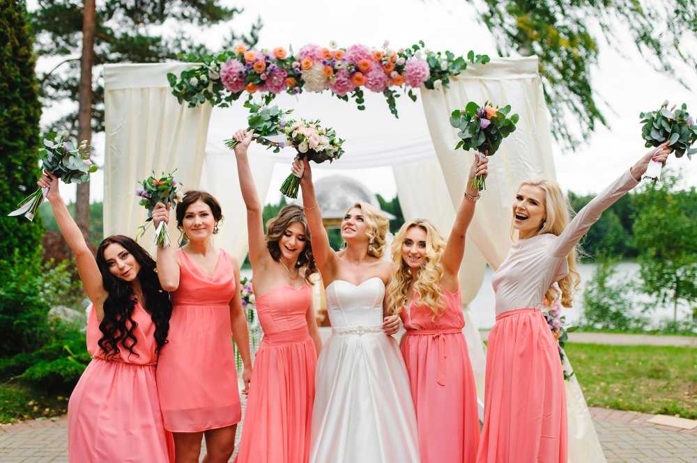 Вот кто прошел вместе с невестой всю дорогу к этому дню. Незаменимые подруги! Можно поймать момент, когда одна из них поправляет ей платье. Или запечатлеть их всеобщее восхищение в момент ее появления. Идей для таких фотографий может быть великое множество, ведь девушки так любят красоваться перед объективом.