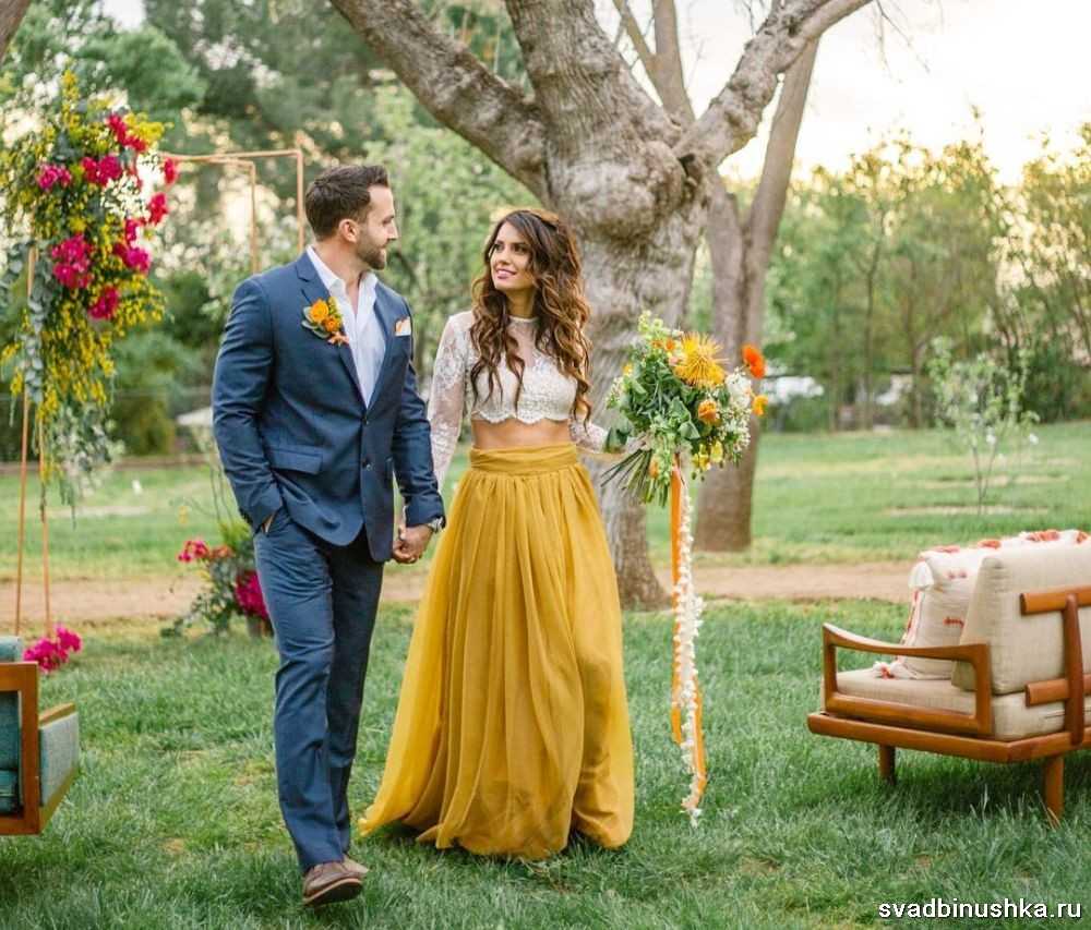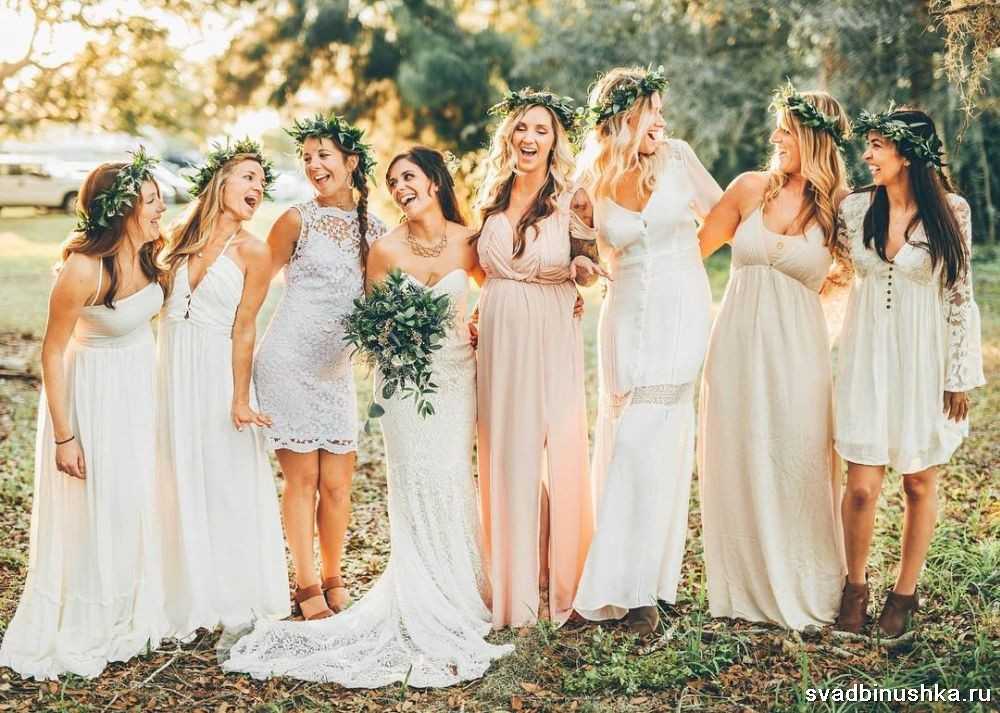 Здесь важно учитывать все аксессуары, которые помогут органично вписаться в стиль каждому участнику праздника. Например, подружки невесты могут выбрать длинные юбки или короткие сарафаны