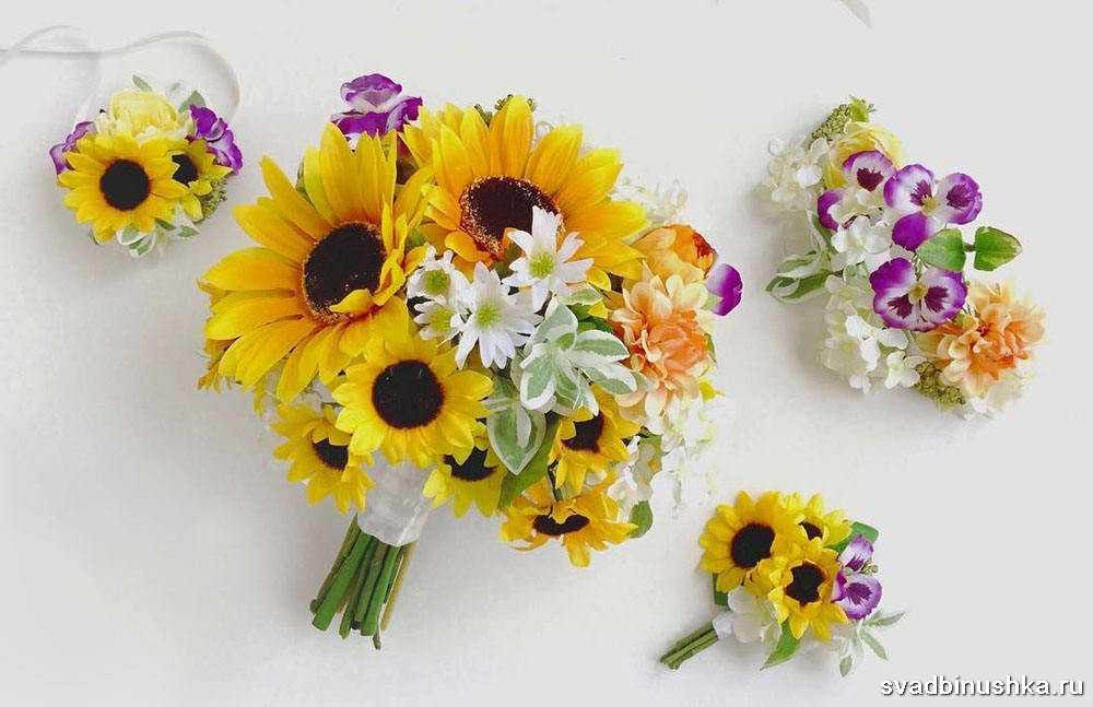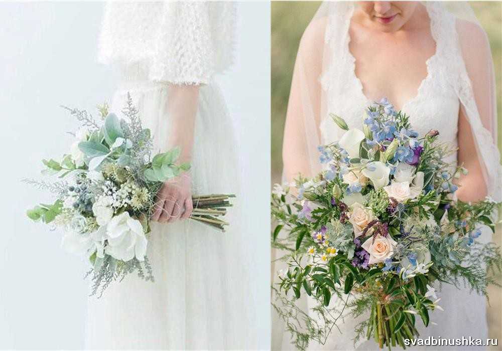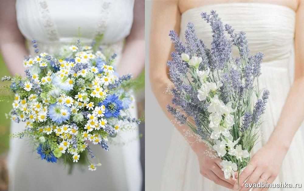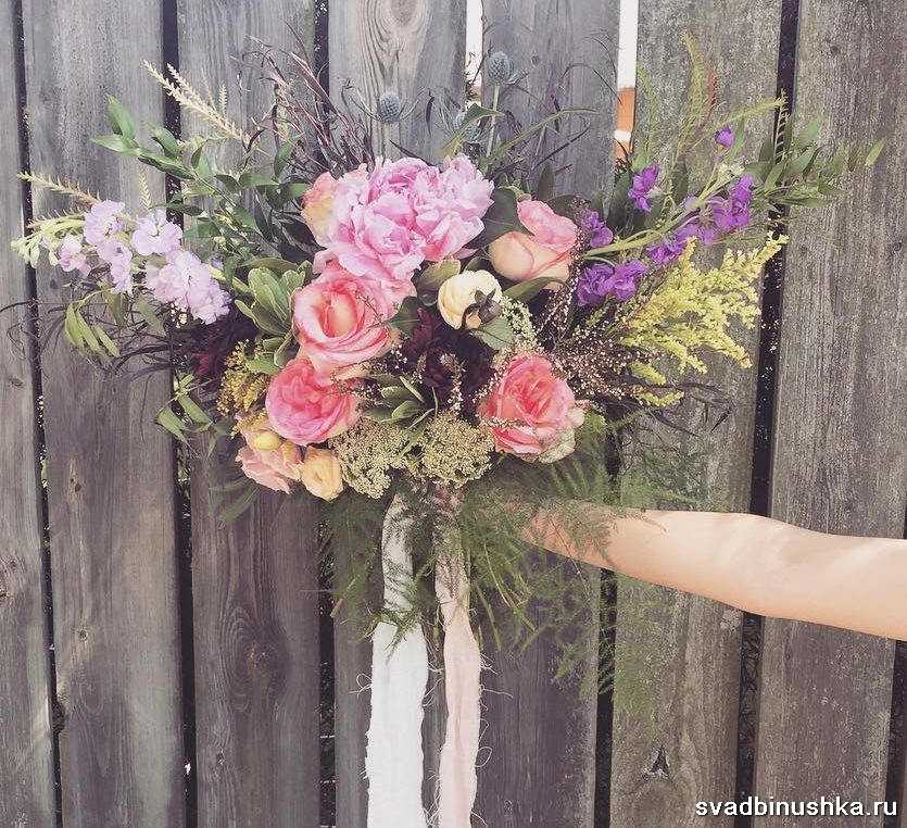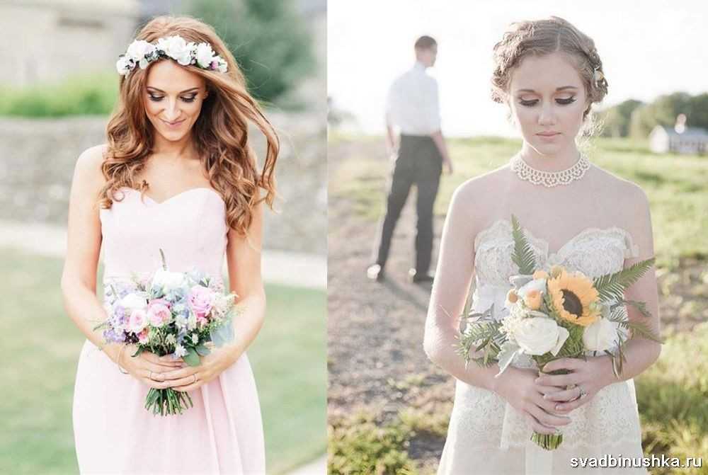 Наиболее гармонично смотрятся в букете полевые цветы, сухоцветы, перевязанные мешковиной, льняной тканью, бечевкой. Важны: естественность, отсутствие броских составляющих, искусственных украшений, таких как жемчуг, стразы. Букет может включать разные полевые цветы, такие как: васильки, сирень, пионовидные розы, ромашки, гладиолусы, колокольчики, лаванду.