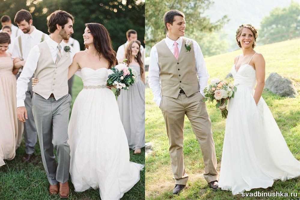 Жених в этот день также должен быть на высоте. Рустикальный образ предполагает любые приглушенно-нежные тональности, кроме черного цвета. Можно выбрать коричневые льняные брюки или хлопковые варианты темно-серого цвета. Рубашка должна быть белой, с коротким или длинным рукавом. Оригинальным вариантом станут подтяжки в тон к брюкам. Они идеально подчеркнут стилистическое направление.