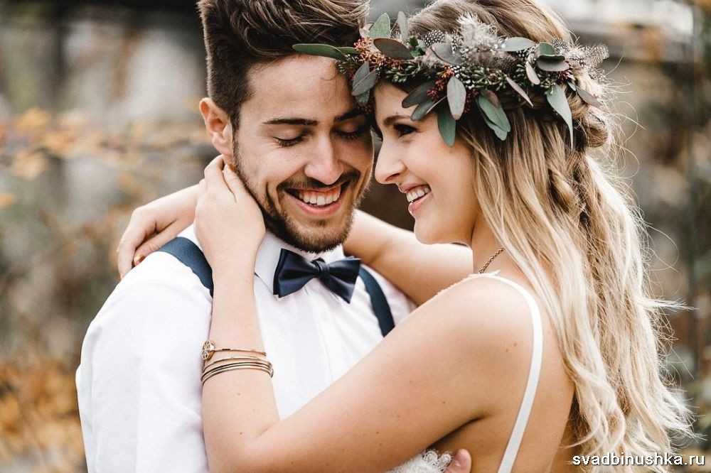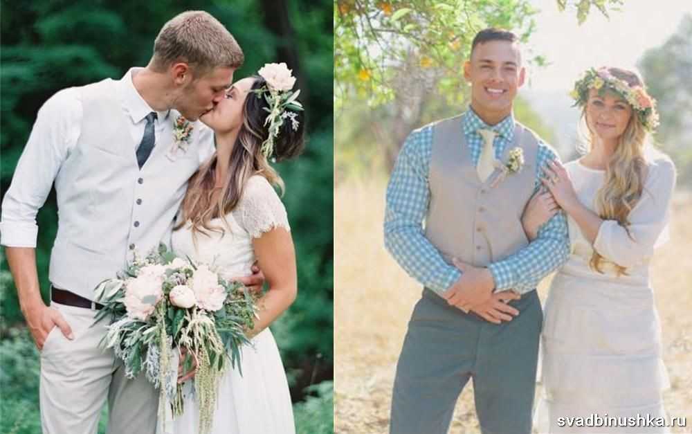 Можно дополнить образ кепкой, жилеткой, но все обязательно должно гармонировать по тональности. Последним штрихом станет бутоньерка. Ее рекомендуется сделать их тех же цветов, что и букет невесты. Вставьте простые ромашки или веточку рябины, чтобы подчеркнуть простоту и привлекательность стиля. Не стоит жениху надевать лакированные туфли черного цвета с острым носом, цилиндр, фрак. Все это совершенно неуместно в данном стиле.