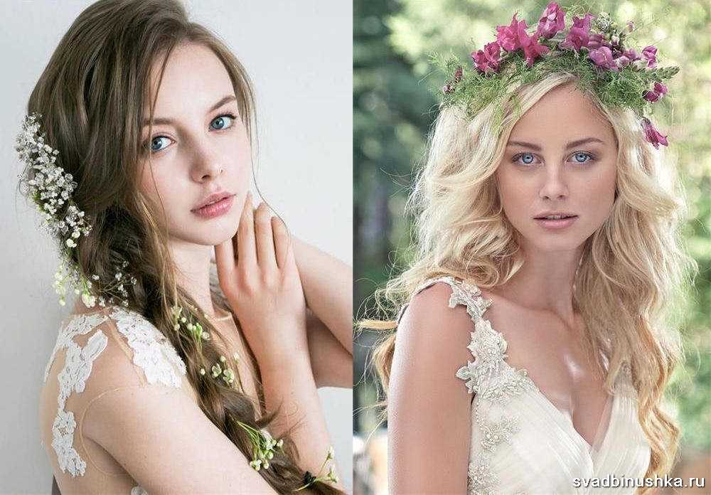 Прическу украшают полевыми цветами или тончайшей диадемой, обручем. Волосы могут быть как распущенные, так и подчеркивающе небрежно заплетены в свободную косу, собраны в хвост, подколоты по типу римской прически.