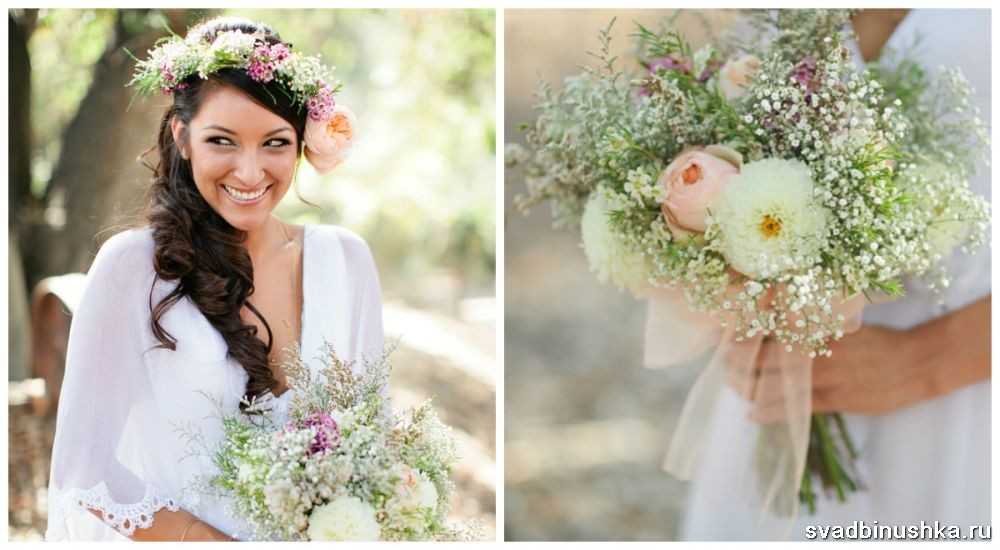 Одежда и прическа просто обязаны перекликаться. Можно красиво вплести в косы лилии. Забудьте о громоздких прическах, интереснее всего здесь будет смотреться простая коса. Очень актуальны деревянные бусы, серьги, браслеты, а также ручная работа. Внимательно выбирайте букет – он должен состоять из любых полевых цветов. Стильно будут выглядеть ромашки, одуванчики. Можно сочетать растения в единой композиции, она должна быть простая, но привлекательная.