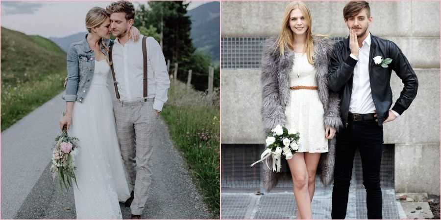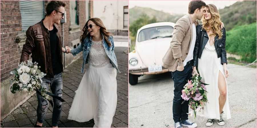 Простые повседневные, а главное, удобные вещички отлично впишутся в лук молодоженов 2020 года. Это могут быть любимые джинсовки или кожанки, современные кардиганы, модные кеды, интересные шляпы, в общем, все то, что люди носят в обычной жизни. С помощью них Вы, несомненно, подчеркнете индивидуальность своей пары и сделаете уникальные фотокарточки.
