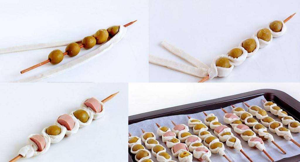 - Взять две полоски из теста и закрепить их у основания шпажки на крайней маслине. Аккуратно упаковывать маслинки и дольки сосиски тестом, перекрещивая полоски, как показано на рисунке.