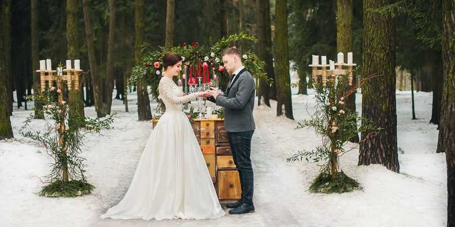 Решили провести зимние фотосессии в лесу, свадьба в канун Нового года? Почему бы и нет. Великолепным вариантом станут фото жениха и невесты на фоне заснеженного пейзажа, где белоснежный подвенечный наряд будет находиться в полной гармонии с окружающей природой, а мужской темный костюм сыграет на контрасте. Определенной романтики добавят букеты, оригинальные свадебные и новогодние реквизиты. Так же для съемки можно использовать диких и домашних животных. Лису, кошку, большую или маленькую собаку, лошадей.