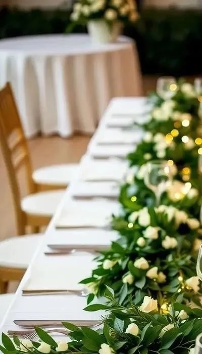 • Декор стульев: Небольшие пучки зелени или короткие цветочные гирлянды на спинках.