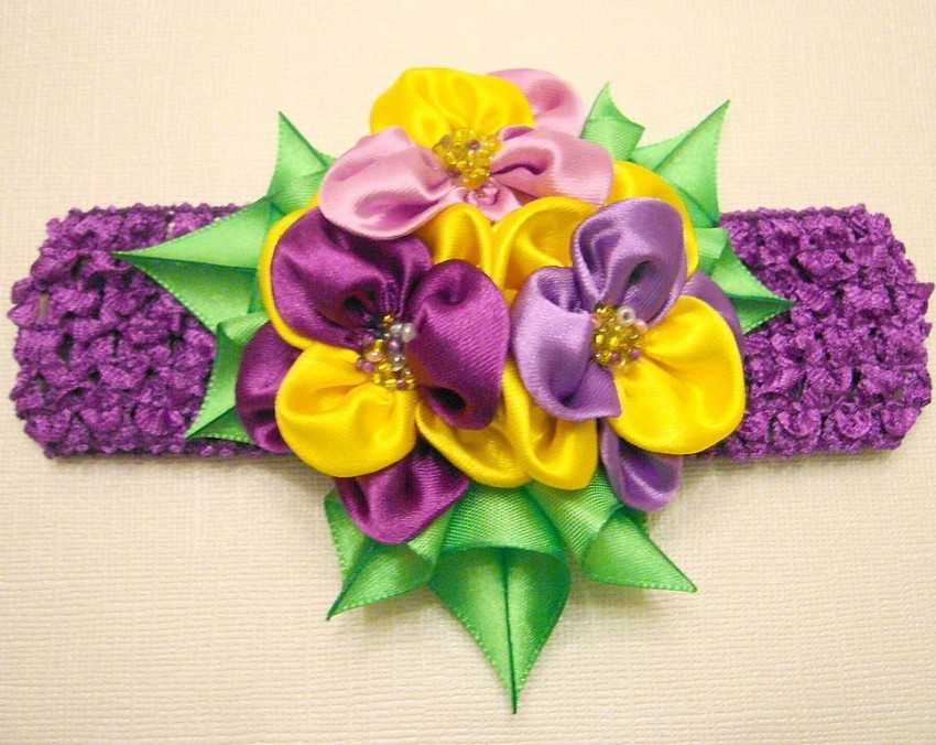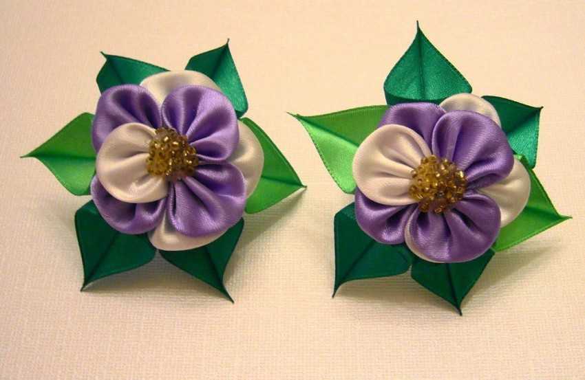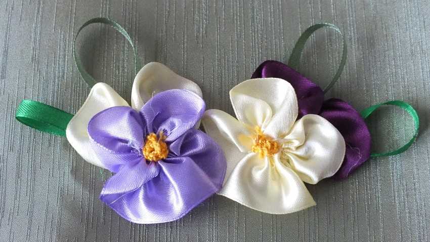 Эти нежные цветочки собираются из двух-трех оттенков фиолетового цвета, а на середину нужно приготовить отрезок тонкой желтой ленты. Вначале формируется внутренняя часть из двух полукруглых лепесточков одного цвета и одного овального лепестка более темного колера. Каждая заготовка собирается на нить, а потом все три части стягиваются вместе.