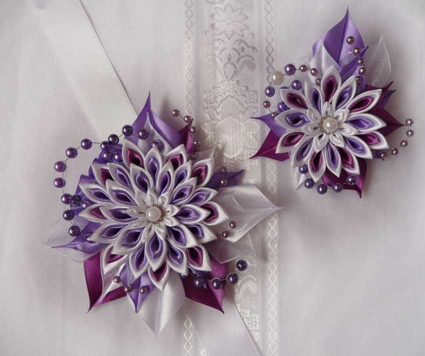 Виды тканевых цветов менялись по месяцам и сезонам. Осенью это были хризантемы, весной – сливы, камелии или магнолии. Благородные, изысканные канзаши сегодня популярны далеко за пределами Японии. В этой технике можно сделать и брошь-букет из атласных лент, например, ко Дню учителя или на свадьбу.