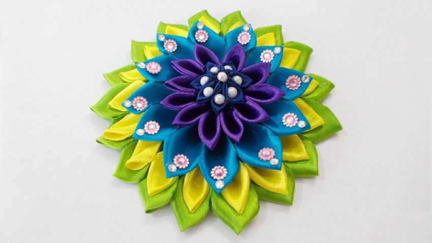 Яркий и пышный многоцветный цветок из атласной ленты шириной 2,5 см дополнен парчой, сверкающей на солнце и при искусственном освещении. Длинные лепестки одинаковые по форме, но за счет использования разных оттенков изделие получается оригинальными кажется сложным. Но сложность здесь одна – нужно сделать много одинаковых деталей.