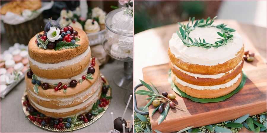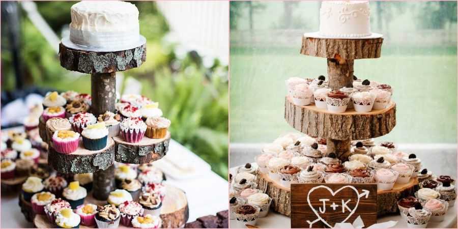 Если все-таки хочется многоярусный торт, то стоит выбирать с минимальным количеством украшений и в нужной цветовой гамме. Акцентом могут служить имитированные веточки дерева, различная ягода, например, малина, черника или клубника, также тортик может быть выполнен в виде деревянного спила или вовсе состоять из капкейков.