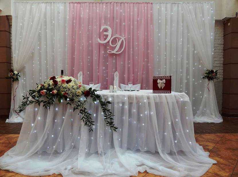 Если для молодоженов выбран исключительно белый оттенок скатерти, то можно выделить ее нижнюю часть драпировкой пастельного оттенка. Также под столешницей организовывают приглушенную подсветку с мягким рассеивающимся лучом.