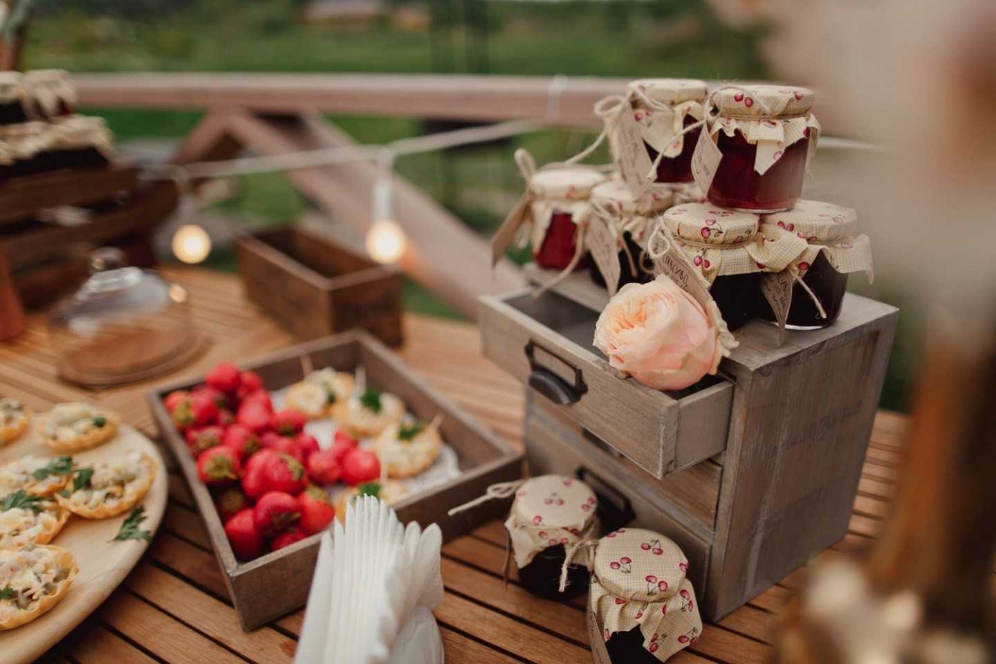 Если ваш список гостей невелик, некоторые элементы декора или полиграфии вы можете сделать самостоятельно, подчеркнув уникальность праздника и порадовав своих близких. Например, в качестве карточек рассадки можно использовать фотографии гостей, а приглашения оформить от руки. А баночки с домашним вареньем или сладости, приготовленные самой невестой, станут отличными комплиментами.