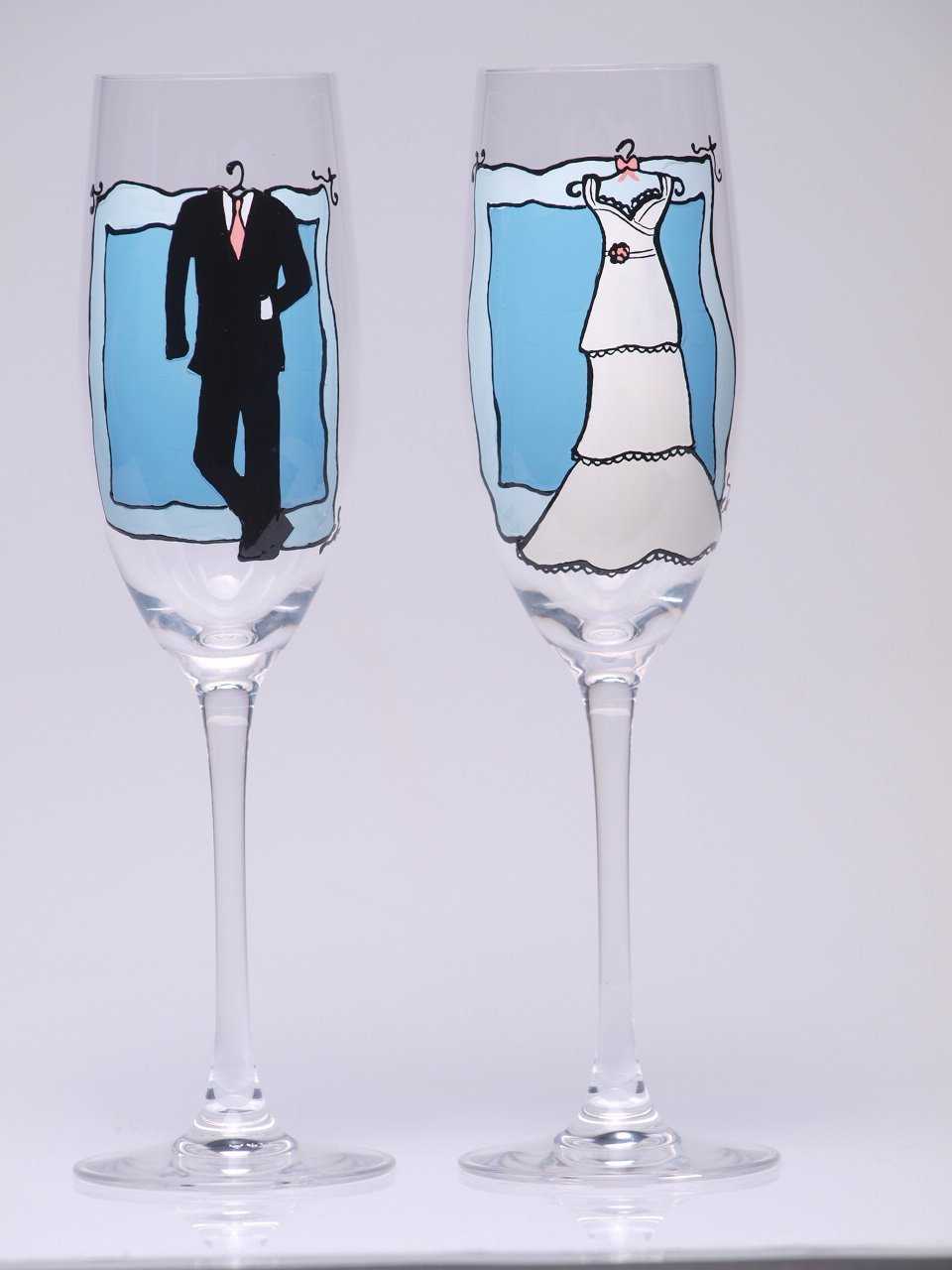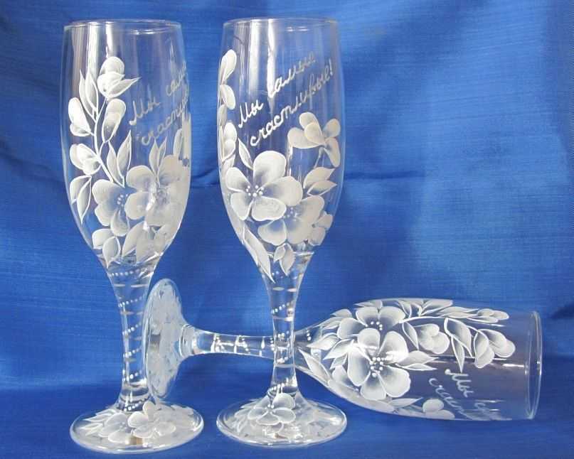 Для того, чтобы оставить собственную роспись на бокалах, нигде учиться не надо. Несколько тренировок накануне свадьбы позволяют быстро освоить скрупулезное ремесло. При выполнении работ нужно позаботиться о чистоте бокалов. Несмотря на широкий выбор, наибольшей популярностью пользуются насыщенные акриловые краски. Перед нанесением ее на поверхность стеклянного изделия, последнее обезжиривается. Благодаря тщательной подготовке атрибута праздничного стола, мастерица осуществляет прорисовку изысканных рисунков с ажурными элементами. Впоследствии изделие покрывается акриловым лаком.