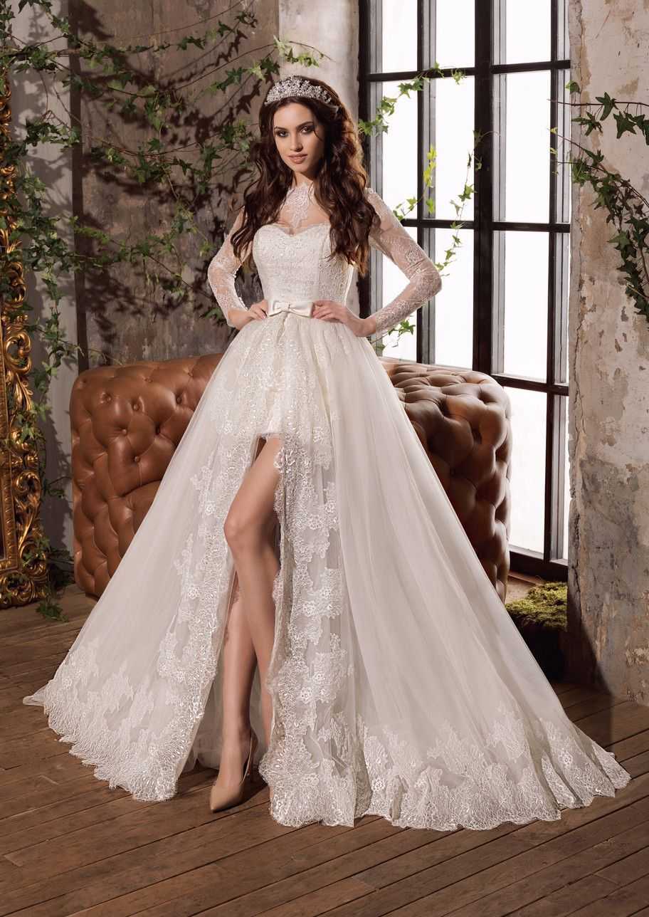 Короткое платье более практично, поскольку его подол не мешает и не пачкается. Но стиль и грация, которые появляются у невесты в длинном наряде, неповторимы. Россыпь камней и вышивка дополняют образ, как и аксессуары.