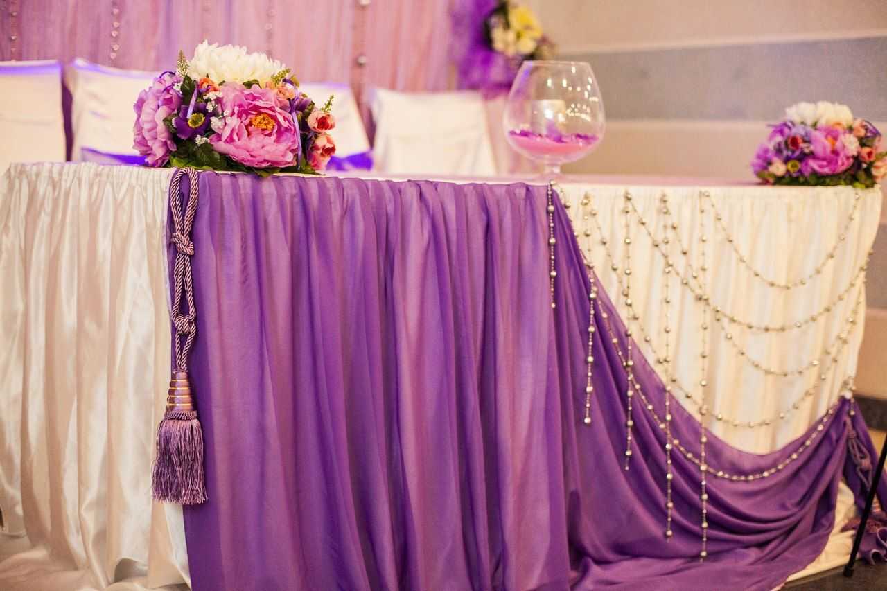 При декорировании свадебного стола просто глупо не использовать ткани: шторы, скатерти, накидки на стулья и салфетки делают обстановку уютной и по-домашнему теплой. Ткань подбирается в соответствии стилю: лен и хлопок присущи рустику, эко-стилю, а сатин и шелк – японскому стилю, иногда – модерну.
