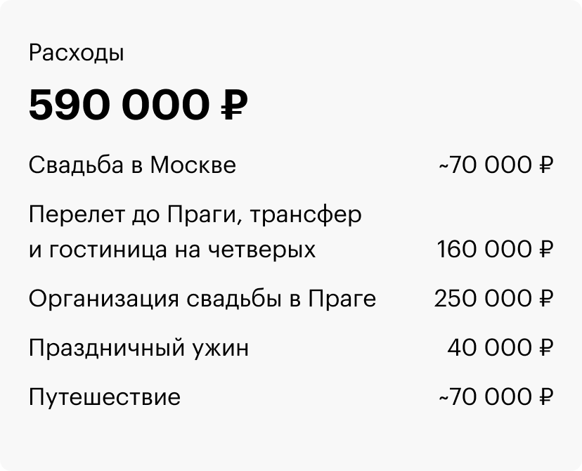 На оба праздника потратили около 500 000—600 000 рублей. У меня были сбережения, к 40 годам это нормально. Жена покупала платье, частично оплачивала перелет и ресторан в Москве.