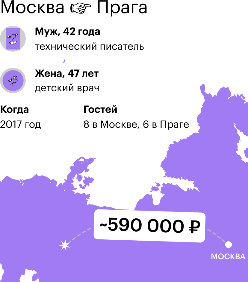 На московской свадьбе у нас было восемь гостей, на пражской — шесть. Еще мы с женой и дети. У меня умерли все близкие, четвероюродных теток звать не хотелось, а большинство друзей перебрались за границу: получили хорошие предложения от крупных компаний. Двое из них прилетели в Прагу из Италии и Швейцарии. С нами в Чехию поехала одна из подруг жены с дочерью, она за все платила сама, я только помогал с организацией. Еще две останавливались в Праге на пару дней по дороге на отдых.