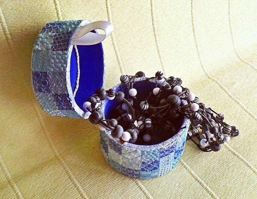 Можно также воспользоваться уплотненным картоном с оболочкой из ткани. Подобная шкатулка с крышкой также будет обладать привлекательным внешним видом и подойдет для хранения драгоценностей. Крышка дублируется синтепоном.
