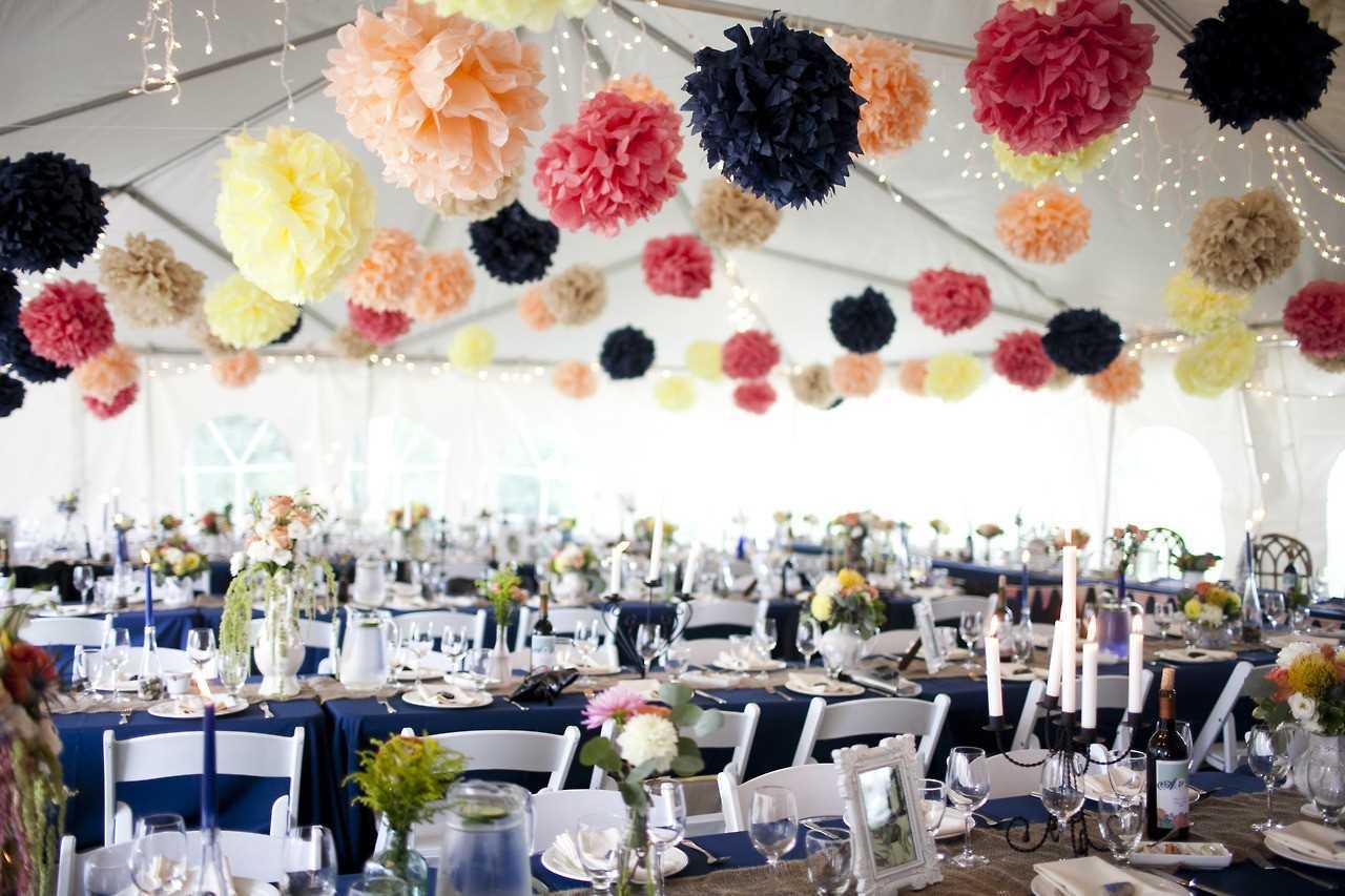 Розовые бумажные цветы в оформлении зала