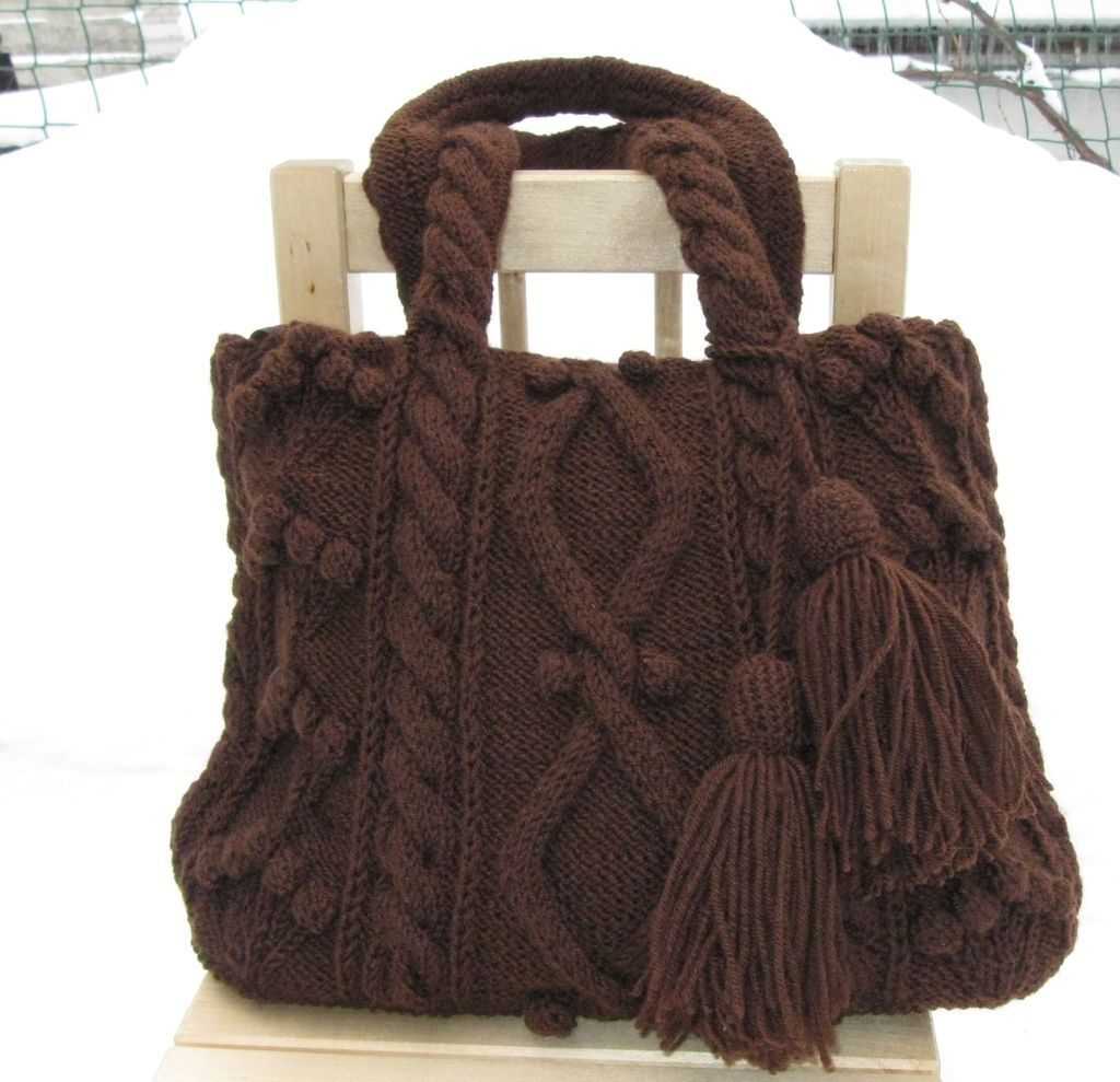 - Вязание на спицах. Используют преимущественно полушерстяную, акриловую пряжу. Чем толще нити, тем объемнее рисунок. Форма сумок получается простая: квадратная, прямоугольная. Вяжут круговыми спицами или двумя, лучше металлическими. Узор подбирают любой, используют даже простую платочную или чулочную вязку, иногда вплетая цветные нити. После завершения работы боковые стороны сшивают. Для поддержания объема требуется подкладка из ткани.