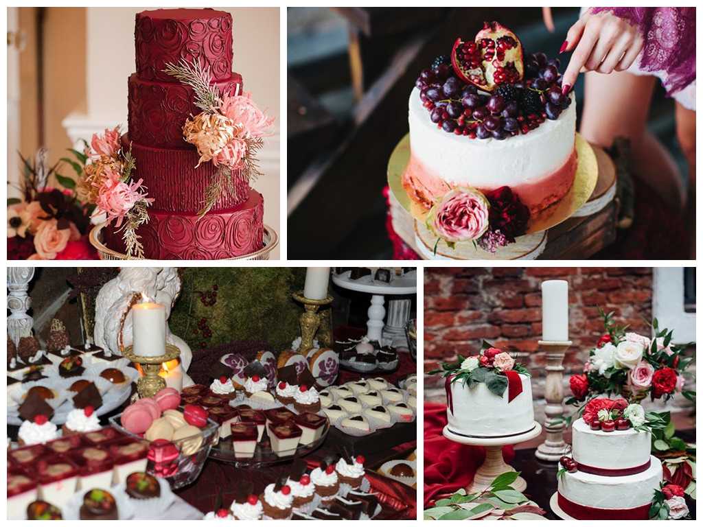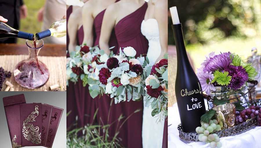 Бордовый – один из наиболее используемых во время свадеб, проводимых осенью и зимой. Он очень насыщенный и темный, поэтому необходимо умело сочетать его с другими, более светлыми цветами, чтобы вся композиция не казалась слишком мрачной.