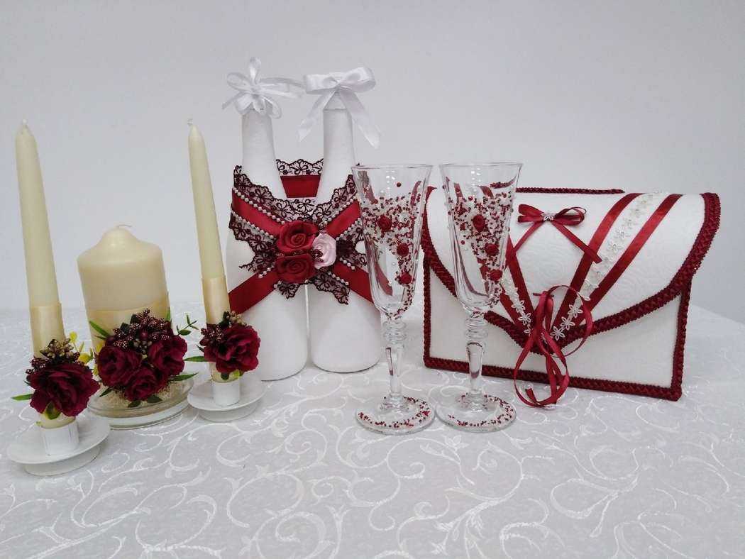 Ткани. Использование всевозможных тканей (шелка, органзы, шифона и других) один из самых красивых способов декорировать праздничный зал. Роскошные плавные драпировки на стенах, длинные шторы, бордовая скатерть, на которой стоит хрусталь и белоснежно-белые тарелки, ленты, украшающие мелкие аксессуары, огромные банты на стульях для гостей, темно-красные чехлы.