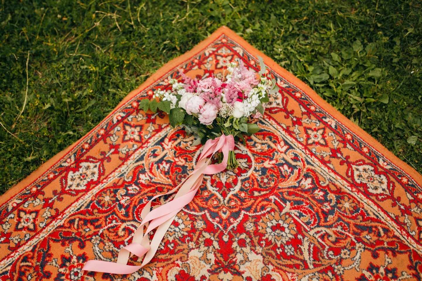Наша «Свадьба во дворе» была простой и яркой. Стиль «бохо» в декоре на нашу тему лёг очень интересно и специфично – растрепанный букет с длинными бархатными лентами, перья, яркие ковры, лампочки, красивые диваны и пуфы. И все под открытым небом. Эта богемная красота в нашем дворе дополнялась высокими яблонями, цветочными грядками и кирпичными подъездами.