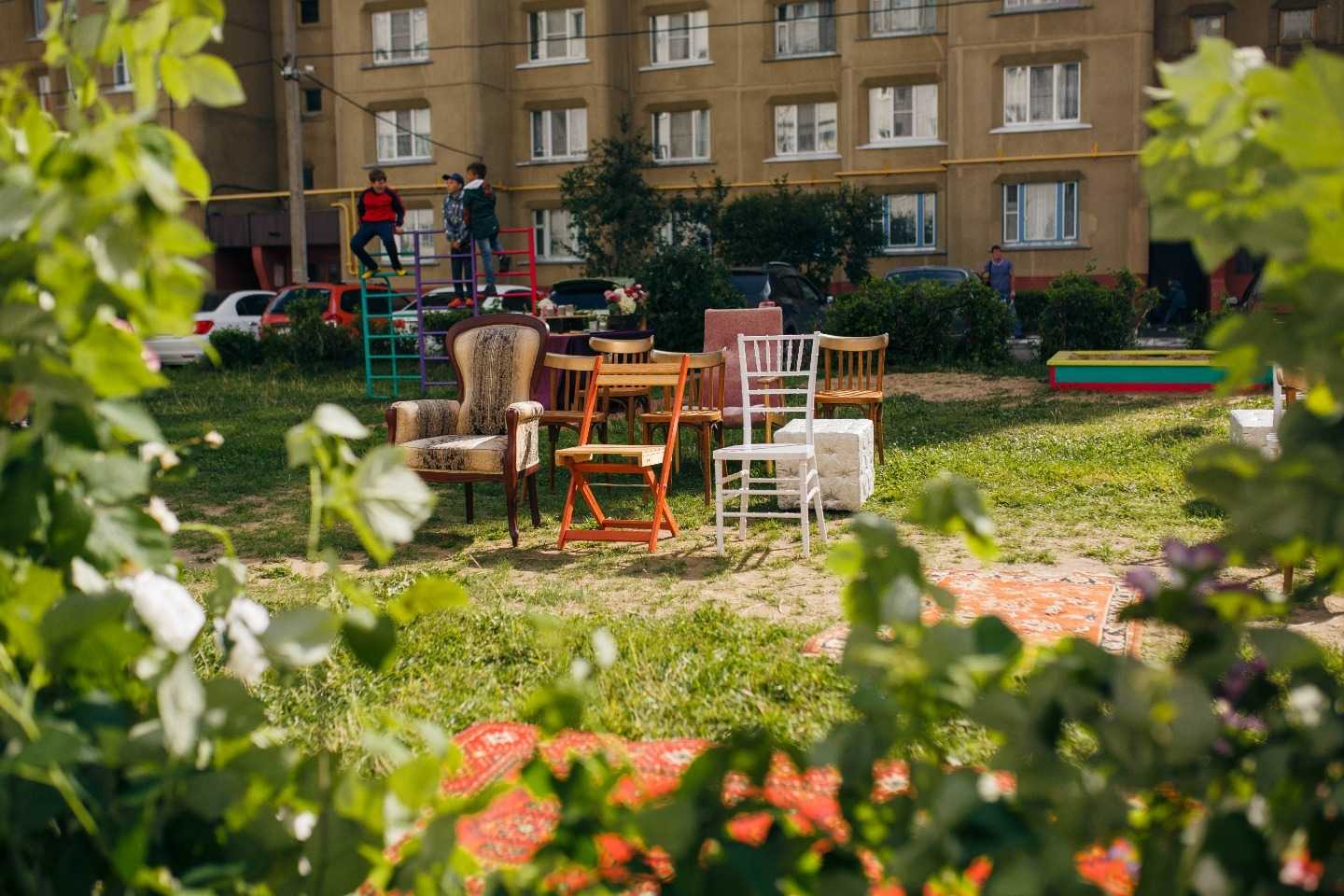 Вся дворовая площадка была задействована и стала отличным местом для развлечения гостей перед началом церемонии – можно было играть в футбол, крутиться на карусели, делать фотографии на фоне стены с граффити. Бегать за цветами к бабушкам, которые сидели через дорогу, угощаться блинами и соленьями тети невесты, танцевать под хиты в исполнении инструментальной группы. Самым ярким украшением нашего дня стали эмоции.